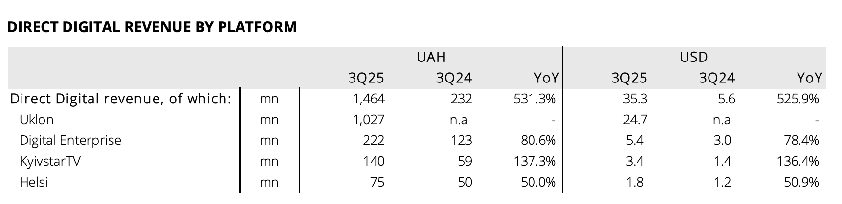- Загальна кількість щомісячних активних користувачів (MAU) цифрових платформ групи (Uklon, MyKyivstar, Kyivstar TV та Helsi) досягла 13,5 млн (+49,4%).