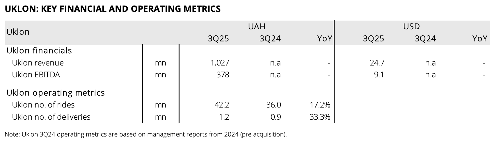 - EBITDA зросла до $ 171 млн (+20,4%) з маржею 57,6%; вклад Uklon: $ 9,1 млн в EBITDA та $ 6,7 млн у скоригований чистий прибуток.