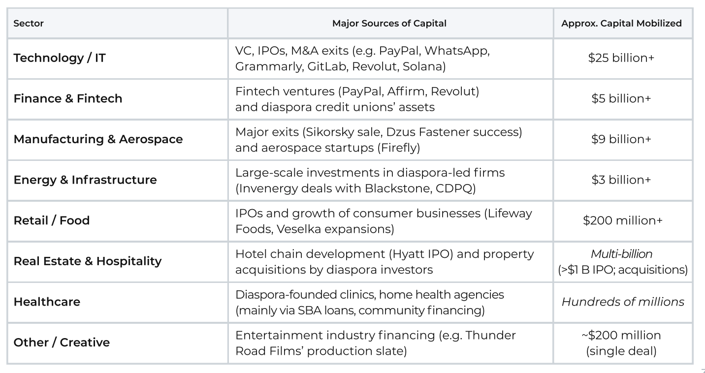 - Технологічні та ІТ-підприємства, засновані представниками української діаспори, залучили понад $25 млрд сукупно, що значно перевищує інші сектори.