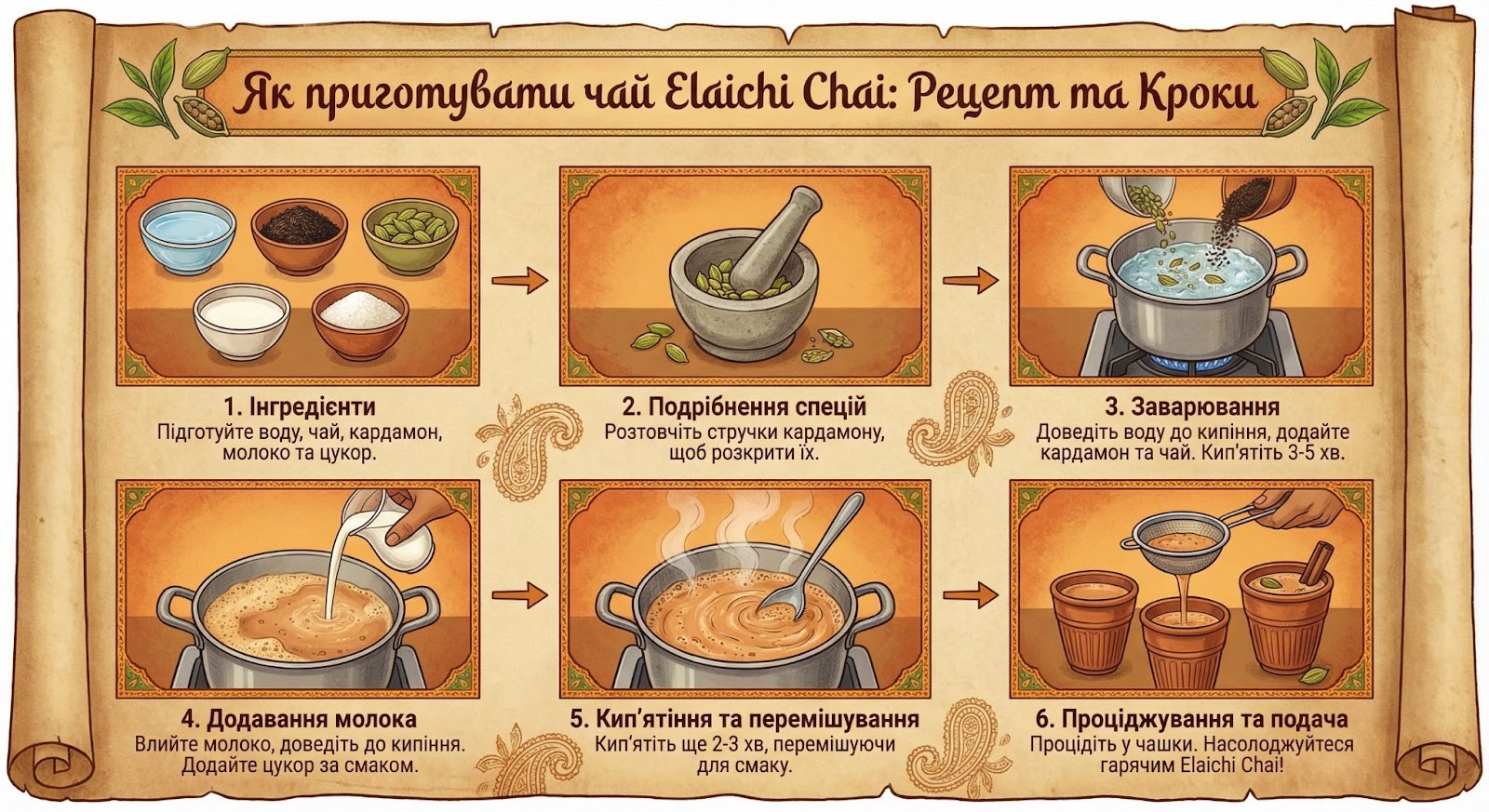 Запит: Створи інфографіку, яка показує, як приготувати чай Elaichi Chai
