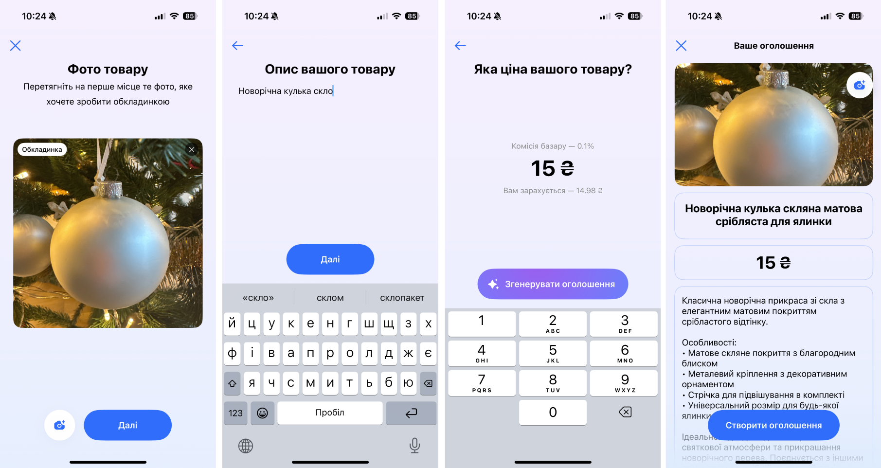 - Додати короткий опис товару, наприклад «айфон, 80% батарея, розбитий екран» та бажану ціну.