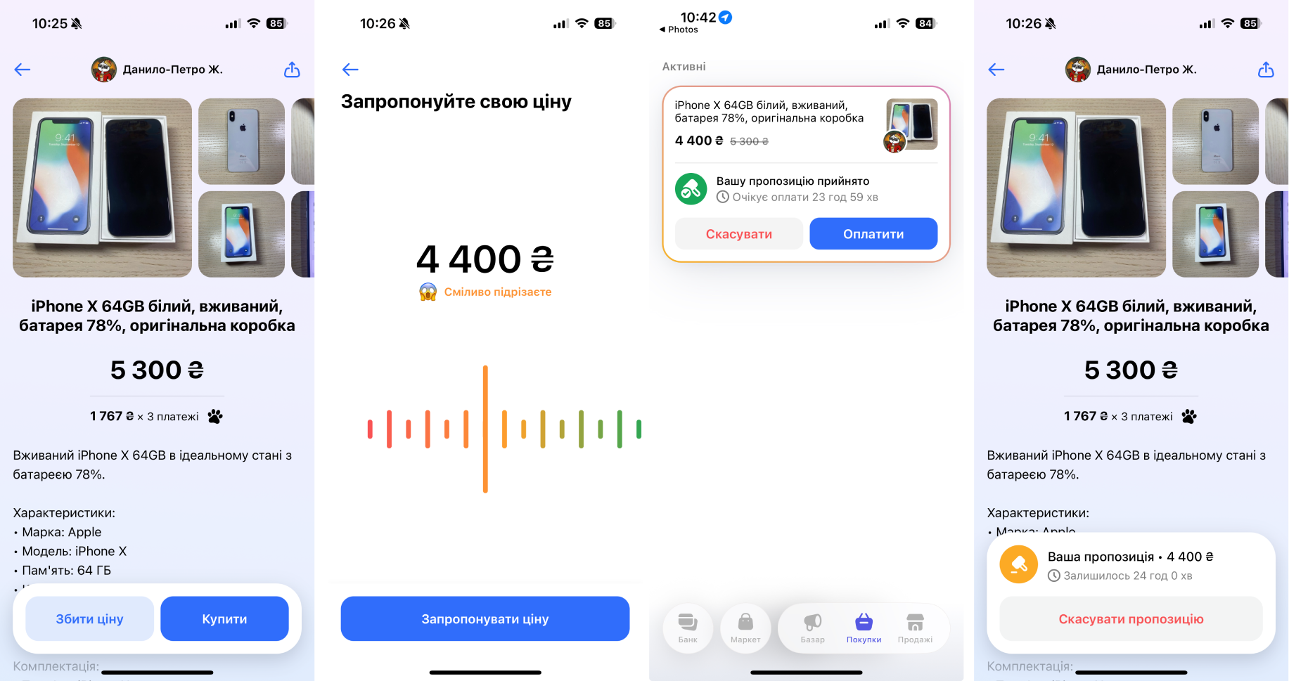 - Цікаво, що на відміну від OLX, Shafa та інших подібних майданчиків, тут немає діалогів з продавцем: якщо покупець хоче поторгуватися, він може запропонувати ціну, а продавець — підтвердити або відхилити пропозицію. Торг відбувається автоматично, прямо в картці товару.
