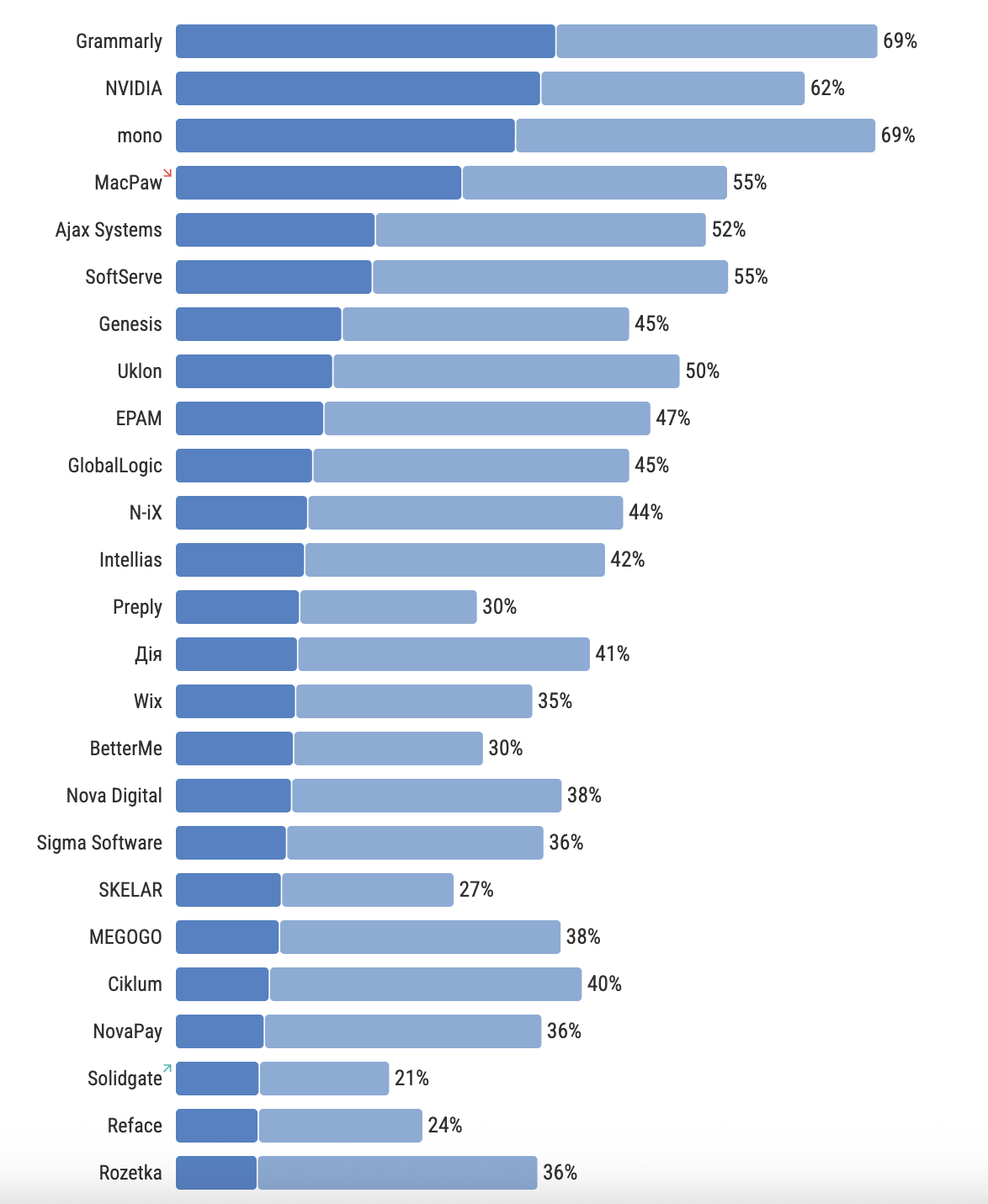 - Серед українських айтівців, які працюють за кордоном, трійка найбажаніших роботодавців залишається незмінною: NVIDIA, Grammarly та mono. Ці компанії мають суттєвий відрив від інших.