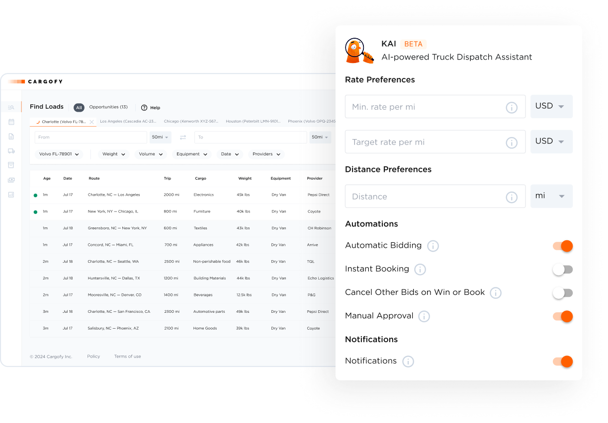 Cargofy — це AI-диспетчер для перевізників, який автоматизує пошук вантажів, бронювання, оптимізацію завантаженості та комунікацію з водіями через інтеграції з основними біржами перевезень і телематичними системами, такими як Samsara та Project44. Один диспетчер, використовуючи Cargofy, може керувати флотом у 10 разів більшим, а автопарк із 315 вантажівок економить до $83 000 на місяць завдяки скороченню простоїв і оптимізації маршрутів.
