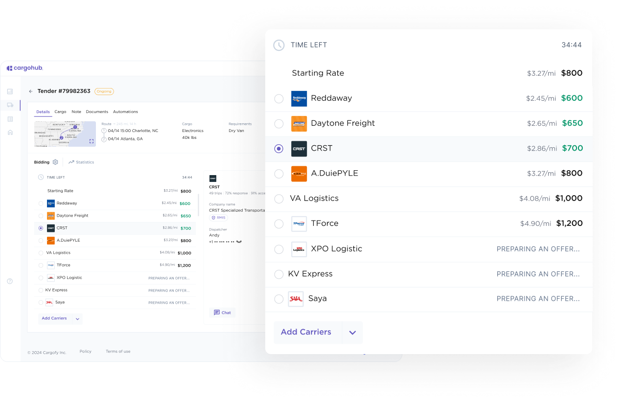 Cargohub — другий продукт компанії, платформа автоматизації закупівель для вантажовідправників і 3PL-операторів, яка оптимізує весь тендерний цикл: від надсилання RFQ до збору ставок, їх ранжування та формування зустрічних пропозицій. У середньому клієнт проводить понад 250 тендерів на місяць, а тривалість закупівельного циклу скорочується з кількох днів до кількох годин. Обидва рішення інтегруються з ERP/TMS та працюють через email, voice AI, WhatsApp і API, дозволяючи компаніям впроваджувати штучний інтелект без змін у поточних процесах.