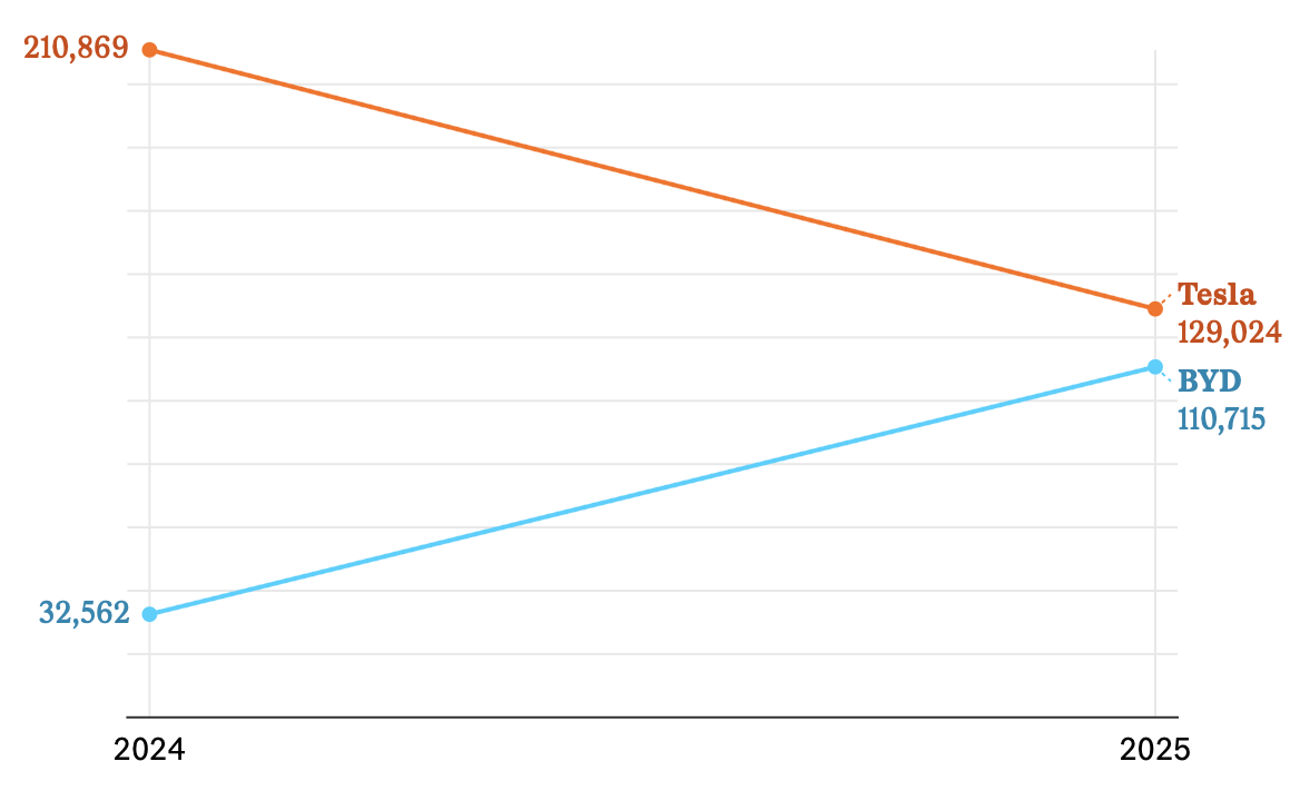 Продажі Tesla у Європі впали на 40%, у BYD — зросли x3