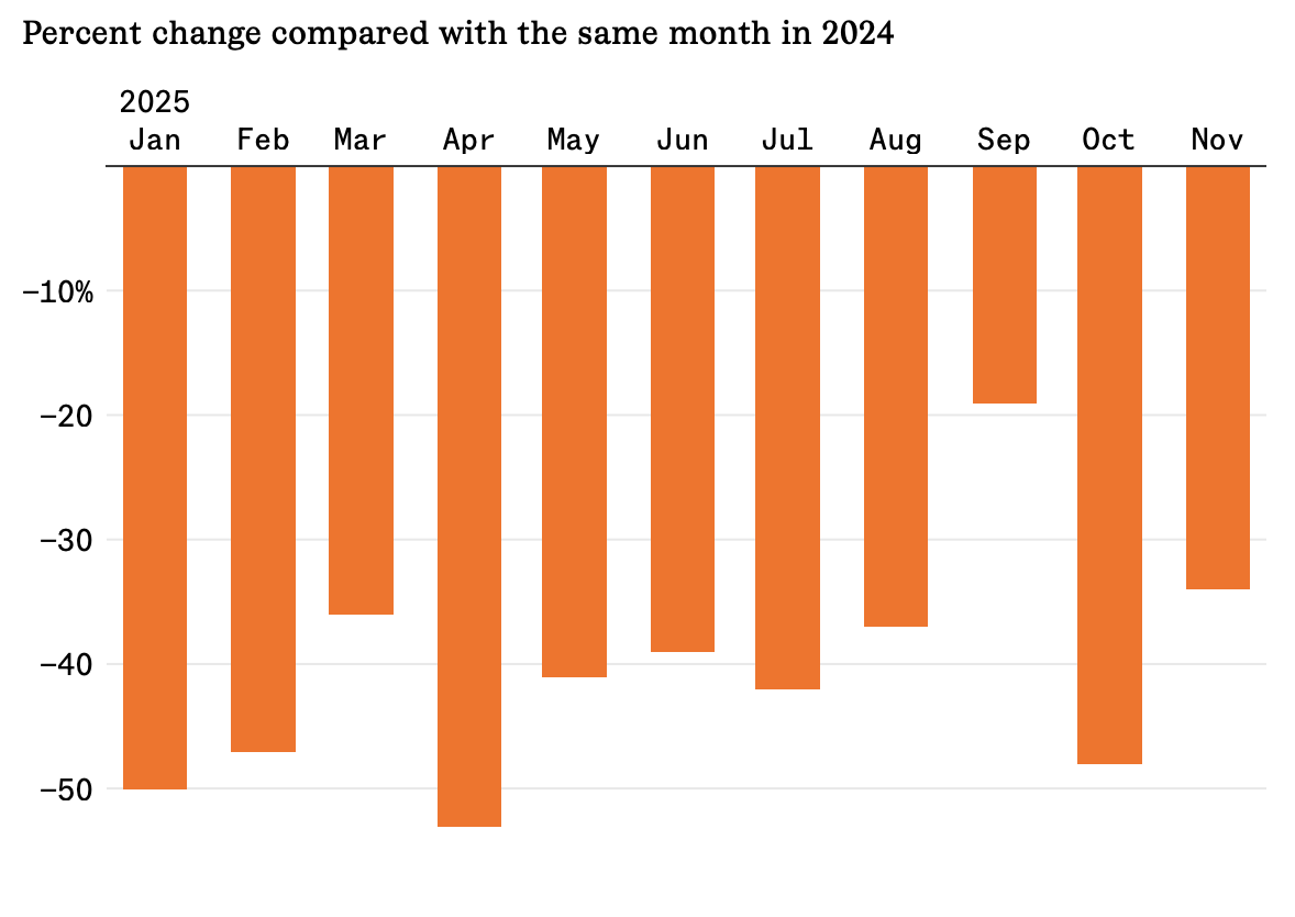 Справи Tesla у Європі продовжують погіршуватись після того, як Ілон Маск почав працювати з Дональдом Трампом та висміювати європейських лідерів, не зрозуміли у Європі і дивне салютування мільярдера. Це радикально повпливало на продажі компанії: за 11 місяців 2025 року продажі знизились на 40%.