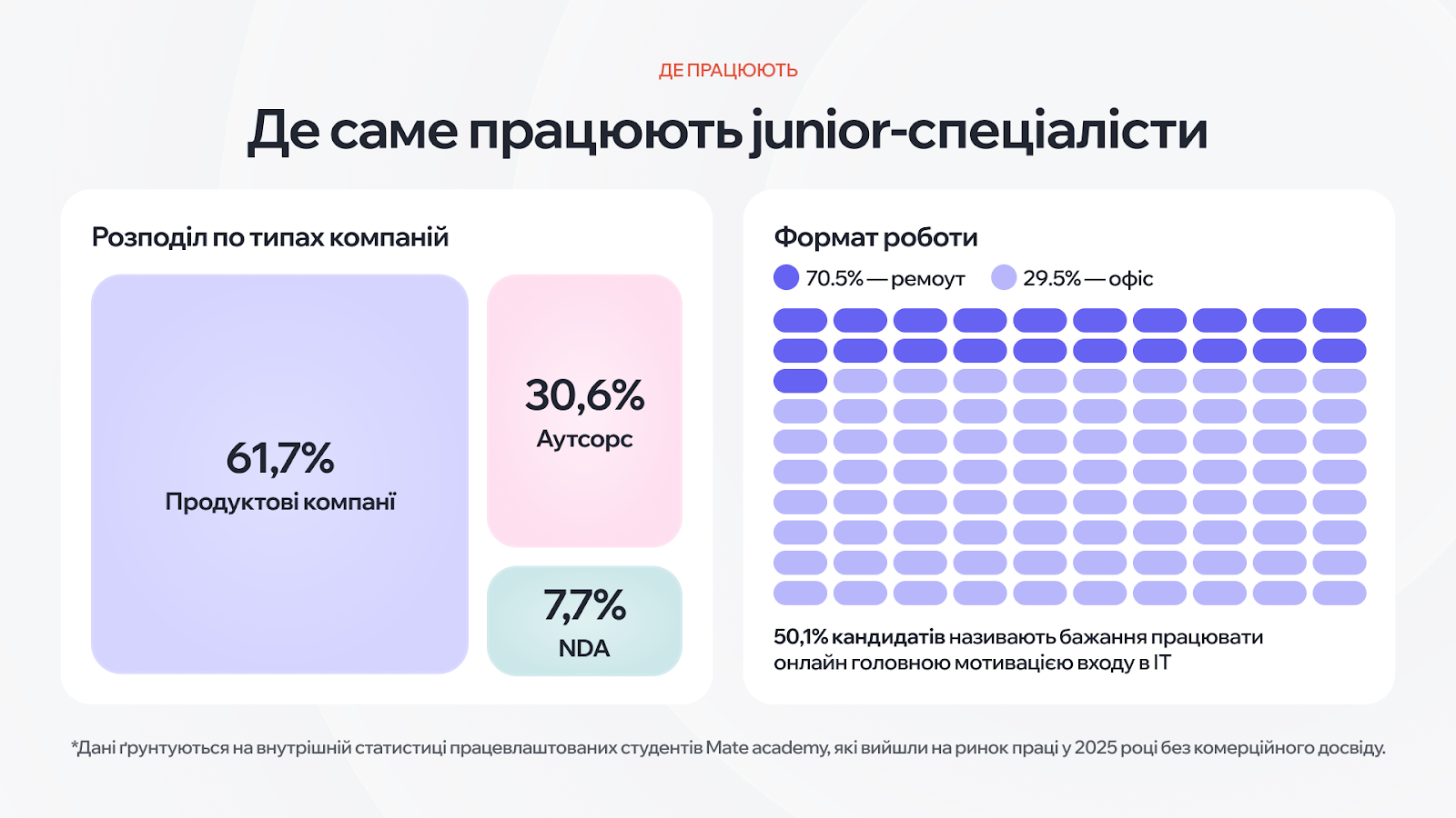 У фактичному розподілі оферів також переважає ремоут (70,5%). Водночас дедалі більше роботодавців вказують вимогу офісу або гібридного формату для junior-позицій, аргументуючи це потребою в швидкому онбордингу, менторстві та контролі якості.
