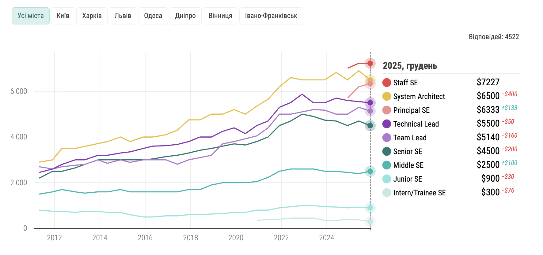 • Загалом медіанна зарплата українських розробників залишається стабільною. У грудні 2025 року вона становила $3450.
