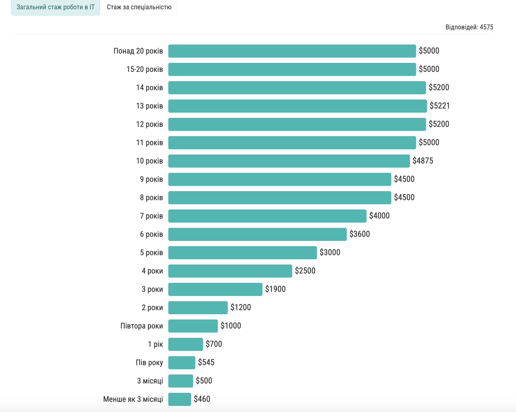 • Медіанна зарплата найдосвідченіших спеціалістів із досвідом 15 і більше років залишилася незмінною порівняно з попередньою хвилею та становить $5000.