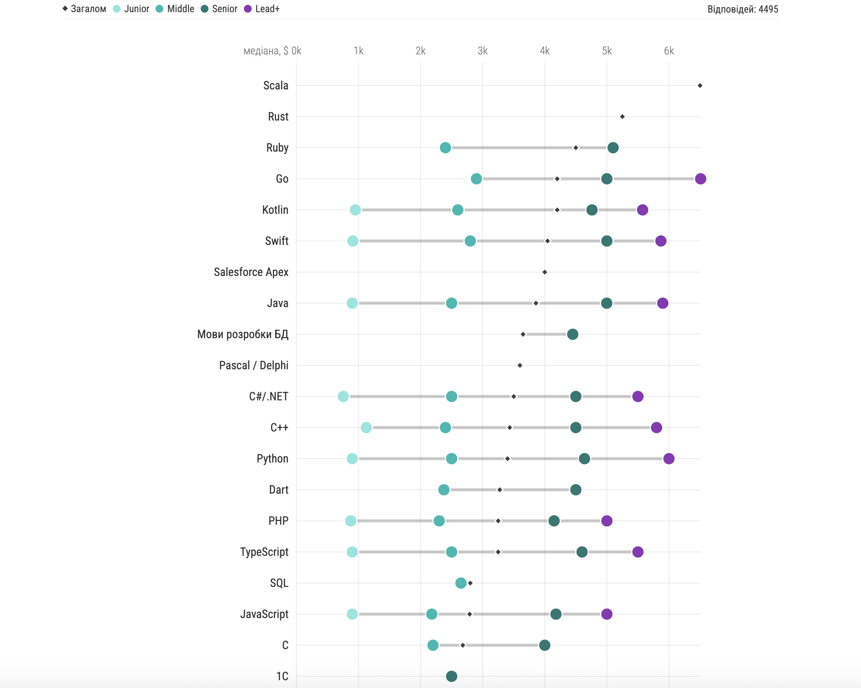 • Найвищу медіанну зарплату мають спеціалісти, які працюють зі Scala — $6500. Також високі показники зафіксовані у фахівців, що використовують Rust ($5250), Ruby ($4500), а також Go та Kotlin — по $4200.