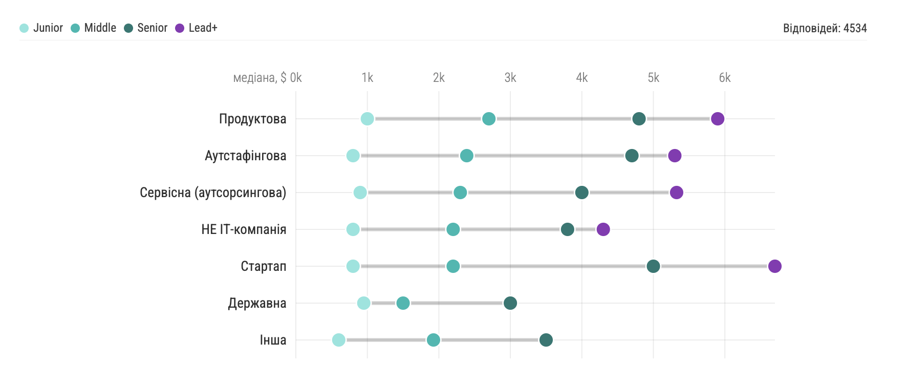 • Продуктові та аутстафінгові компанії, а також стартапи в середньому платять розробникам більше, ніж сервісні або не ІТ-компанії (банки, телеком, ритейл тощо). Водночас медіанні зарплати суттєво відрізняються залежно від тайтла та типу компанії.