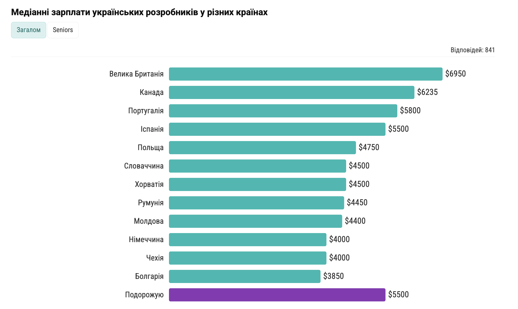 • Найвищі «чисті» медіанні зарплати у українських розробників, які зараз живуть у Великій Британії, Канаді, Португалії та Іспанії, а також у тих, хто постійно подорожує. Найнижчі медіанні зарплати залишаються в Німеччині, Чехії та Болгарії.