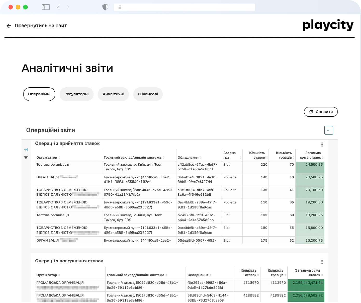 - активність гравців за видами азартних ігор;