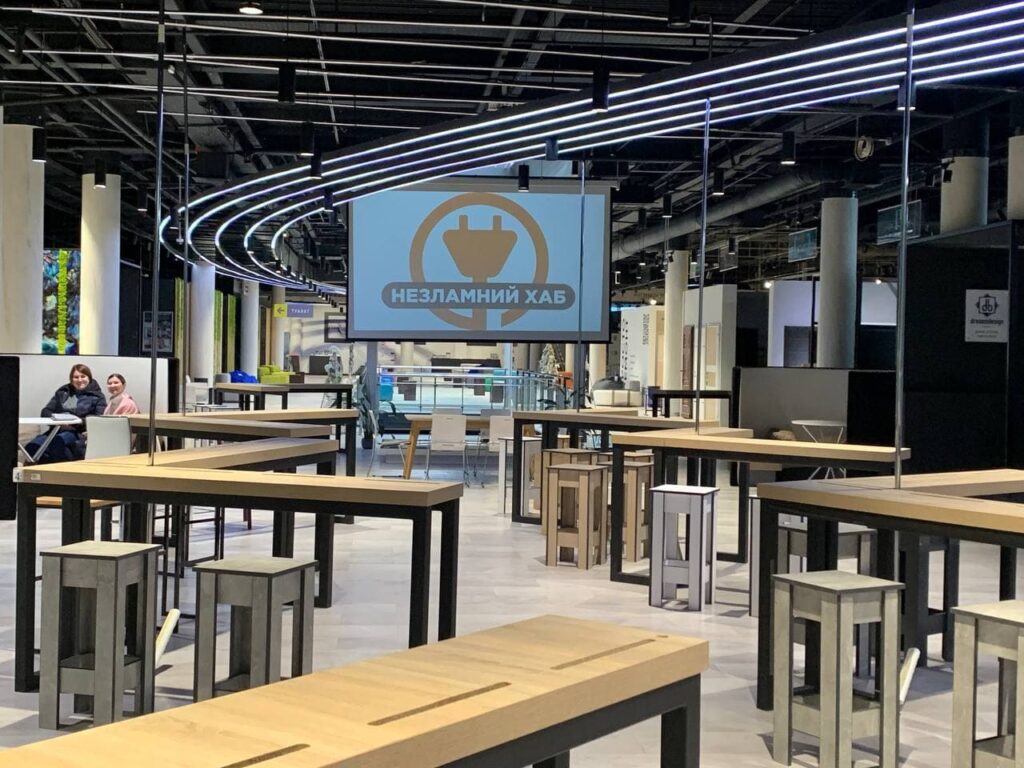 Через складну ситуацію в енергетиці «Епіцентр» відновив роботу хабу в торгівельному центрі на Почайній. Це безкоштовний простір для роботи та відпочинку на 80 робочих місць, де можна підзарядити гаджети та випити кави.