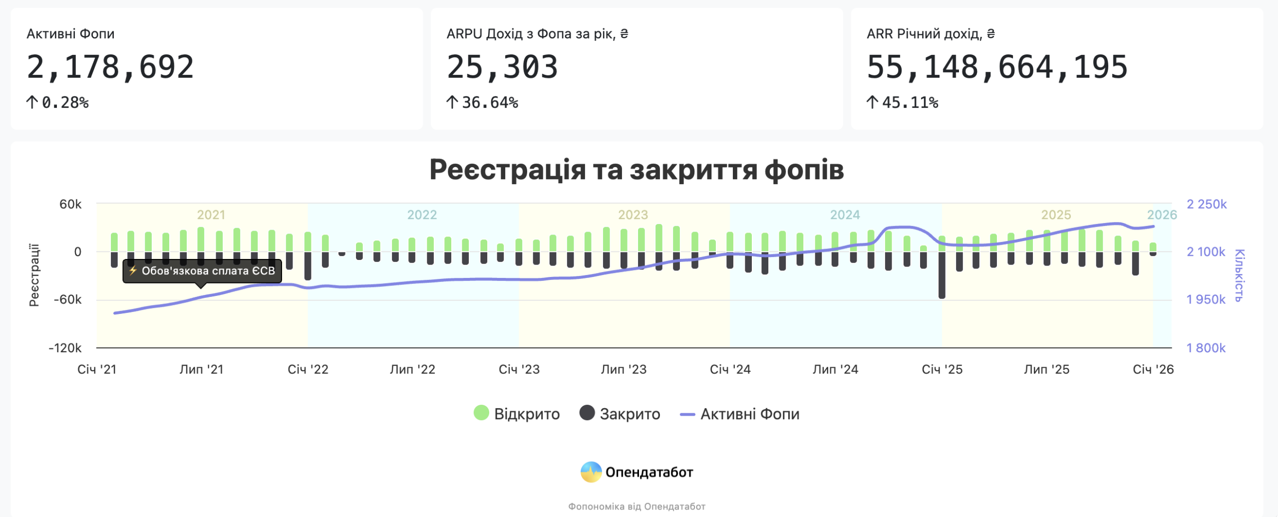 - Сервіс роботи з відкритими даними Opendatabot вже проаналізував найбільш актуальні дані з реєстру. В Україні у 2026 році нарахували 2,1 млн ФОПів – це на 6000 більше, ніж у кінці 2025 року. Загалом за 4 роки повномасштабної ФОПів побільшало на 194 000.