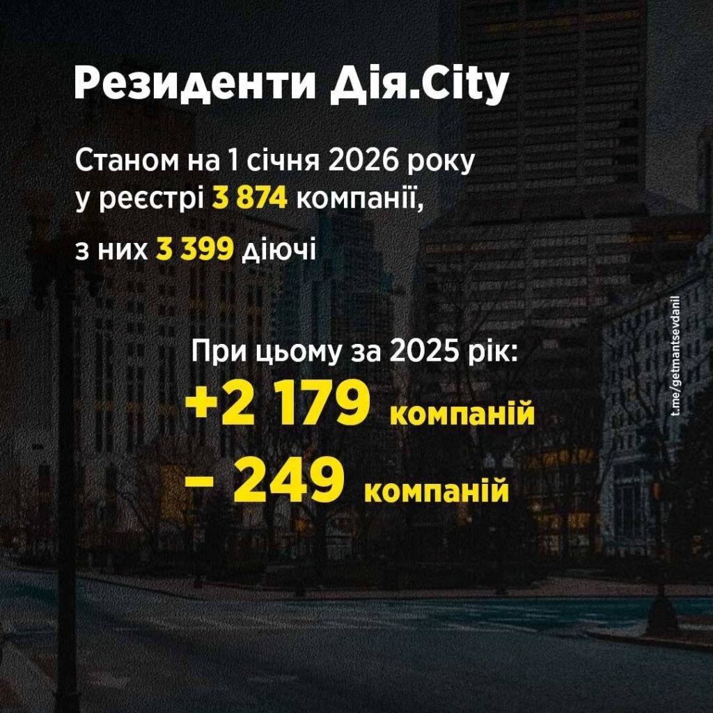 Станом на 1 січня 2026 року ми маємо 3 874 зареєстрованих резиденти, з яких 3 399 є активними компаніями. Причому за рік до спецрежму приєдналися 2 179 нових компаній (виключено 249) – тобто 2025-й став для «Дія.City» періодом активного зростання.