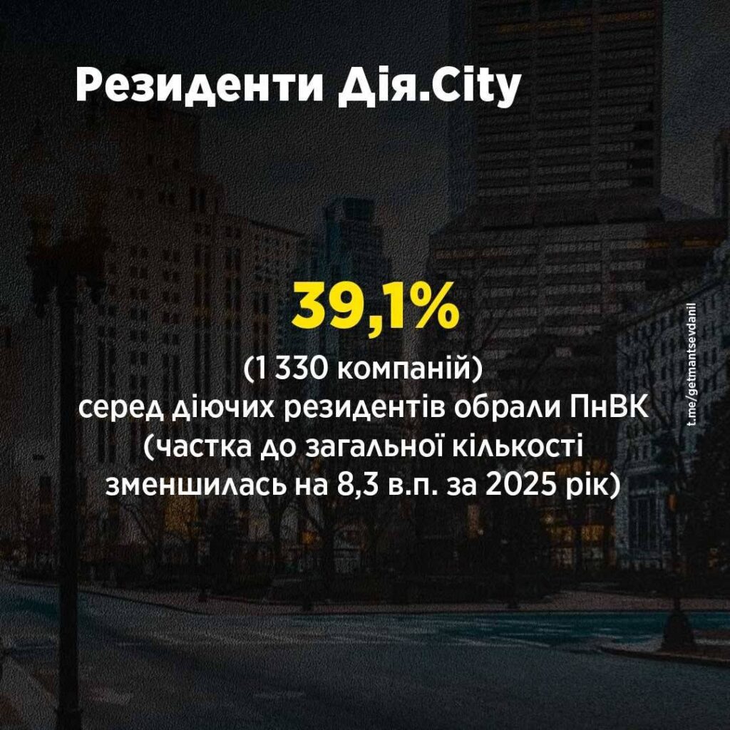 • 39,1% (1 330 компаній) серед чинних резидентів обрали ПнВК (частка до загальної кількості зменшилась на 8,3 в.п. за 2025 рік). Протягом 2025 року 526 компаній перейшли на ПнВК, 83 – відмовились.