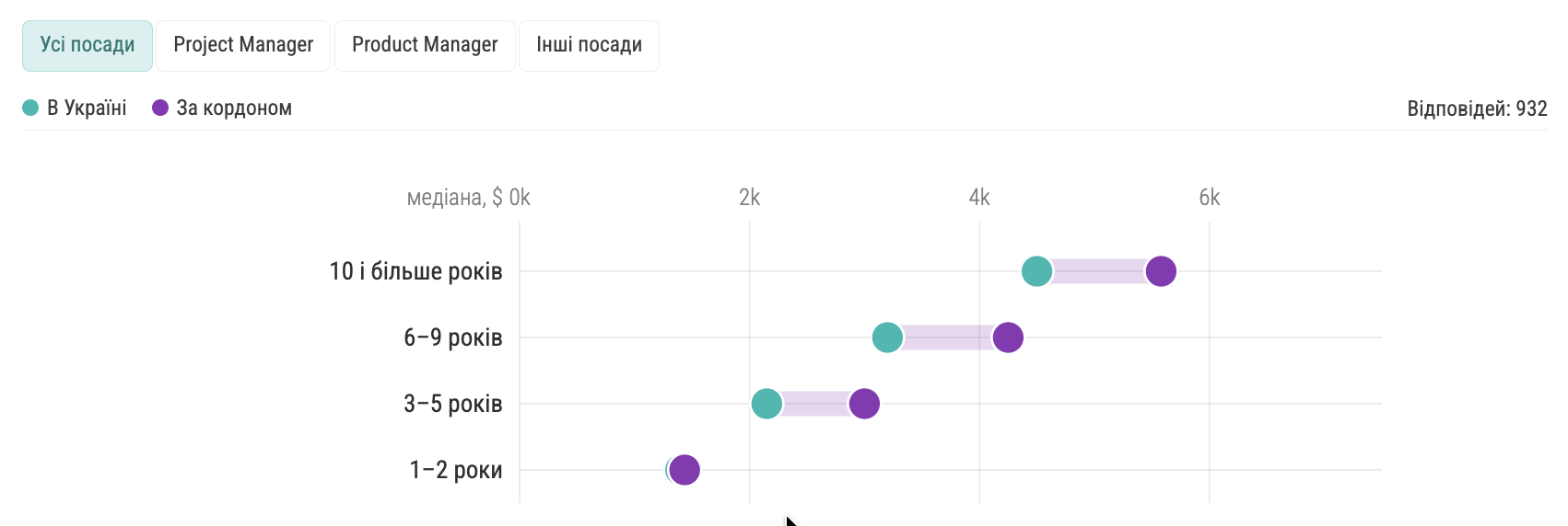 є суттєво вищими за кордоном порівняно з Україною. Розрив в оплаті праці є значним і варіюється від $850 для спеціалістів з досвідом 3–5 років до $1050–1080 для більш досвідчених менеджерів.