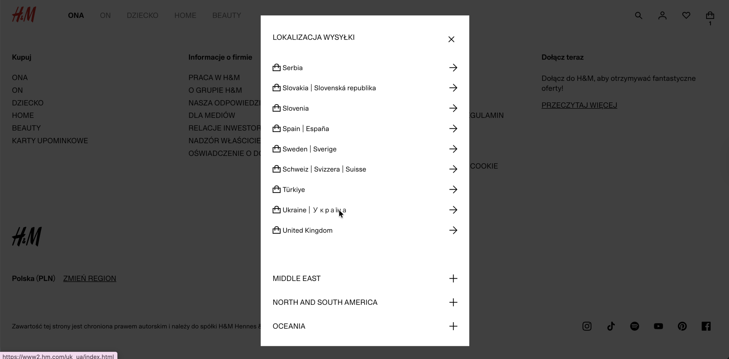 • Щоб перейти на українську версію сайту, необхідно змінити свій регіон у футері сайту. Для цього оберіть «Europe» -> Україна.