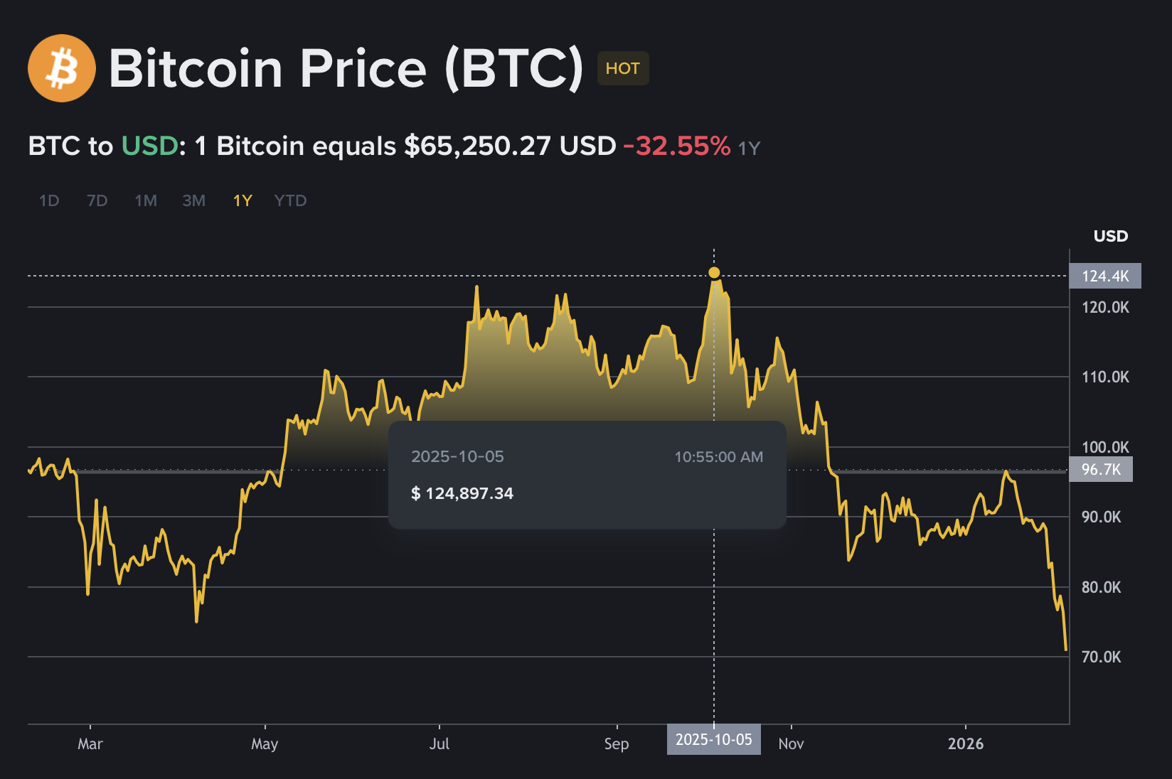 В моменті біткоїн просів до $60 062,00 на тлі посилення розпродажу криптоактивів під час нічних торгів. На піку біткоїн коштував $126 000.