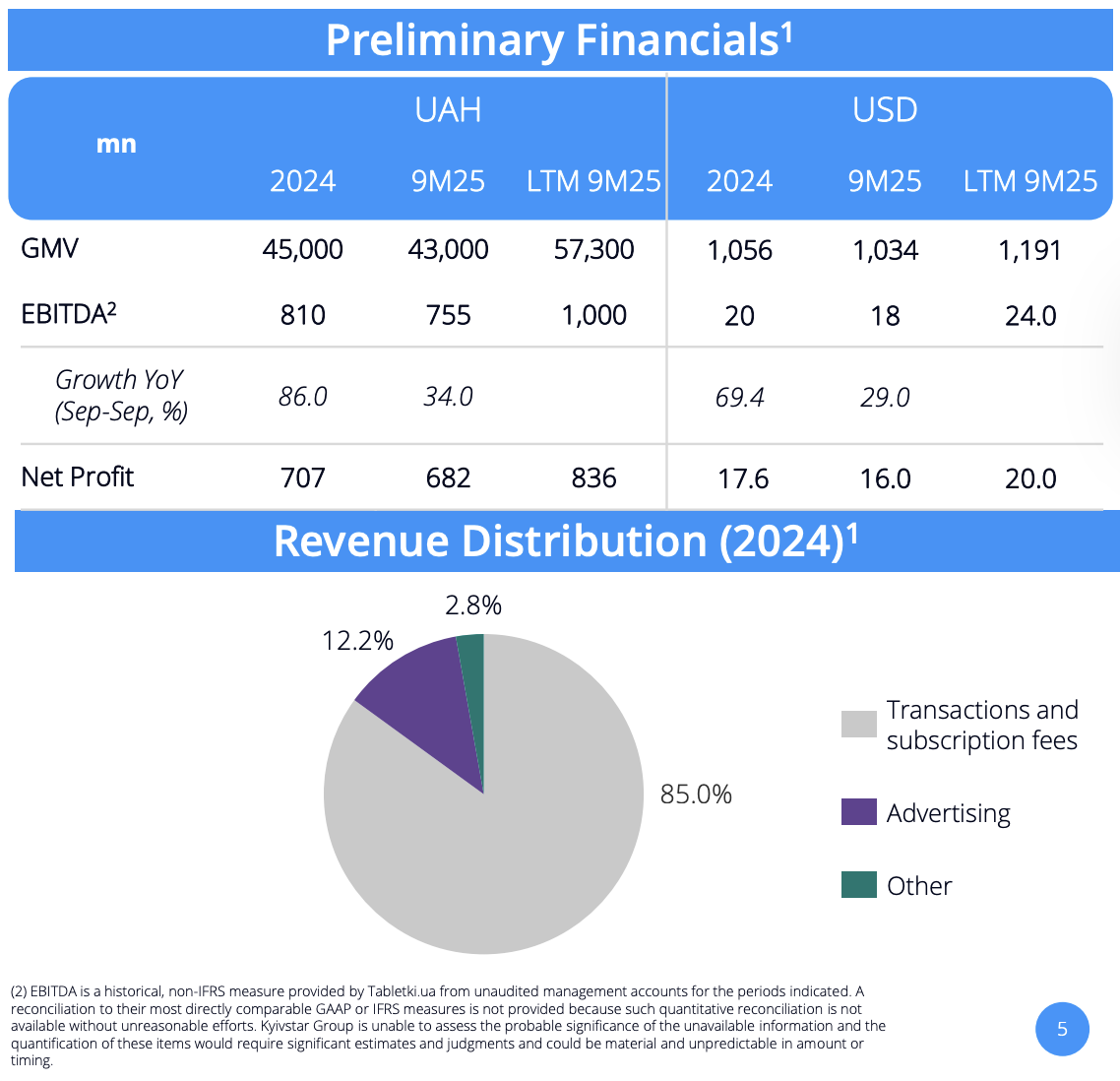 • Згідно з неаудованою управлінською звітністю, Tabletki.ua за останні 12 місяців згенерувала EBITDA у розмірі $24 млн та $20 млн чистого прибутку станом на 30 вересня 2025 року.