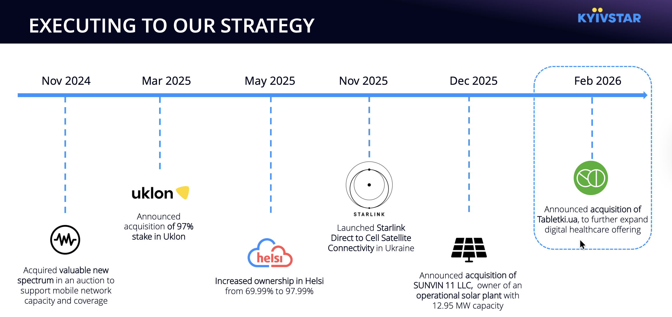• «Київстар» також опублікувала презентацію для інвесторів, в якій, зокрема, підсумовується M&A стратегія компанії. Так, синергія між телеком-оператором Kyivstar, найбільшим провайдером eHealth SaaS в Україні Helsi, доставки та таксі Uklon і, нарешті, маркетплейсом ліків Tabletki.ua, за оцінками компанії, має створити суттєву додану цінність для клієнтів, підсилити залученість в екосистему та, як наслідок, її подальше зростання.