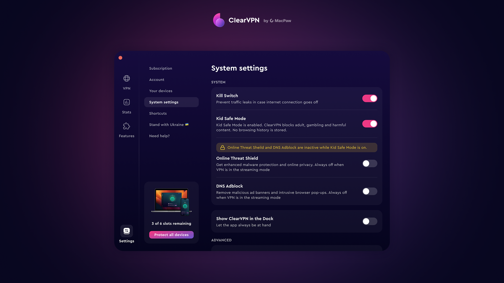 • Нова функція вже доступна у ClearVPN на комп’ютерах, планшетах і смартфонах, що дозволить захистити максимальну кількість пристроїв, якими користуються діти.