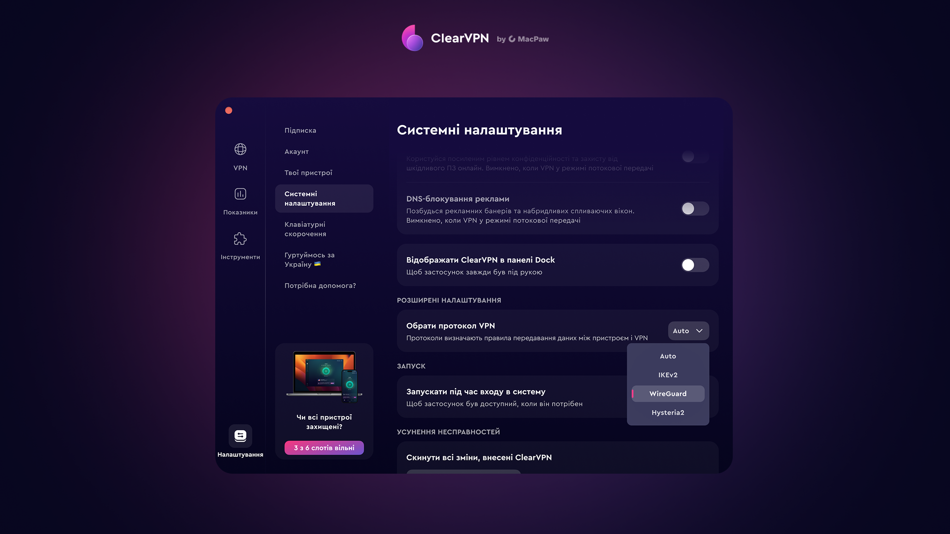 • Окрім нового режиму для дітей, ClearVPN отримав ще одне важливе оновлення. У застосунок додали новий протокол WireGuard, що зробить ClearVPN швидшим, більш стабільним і захищеним.