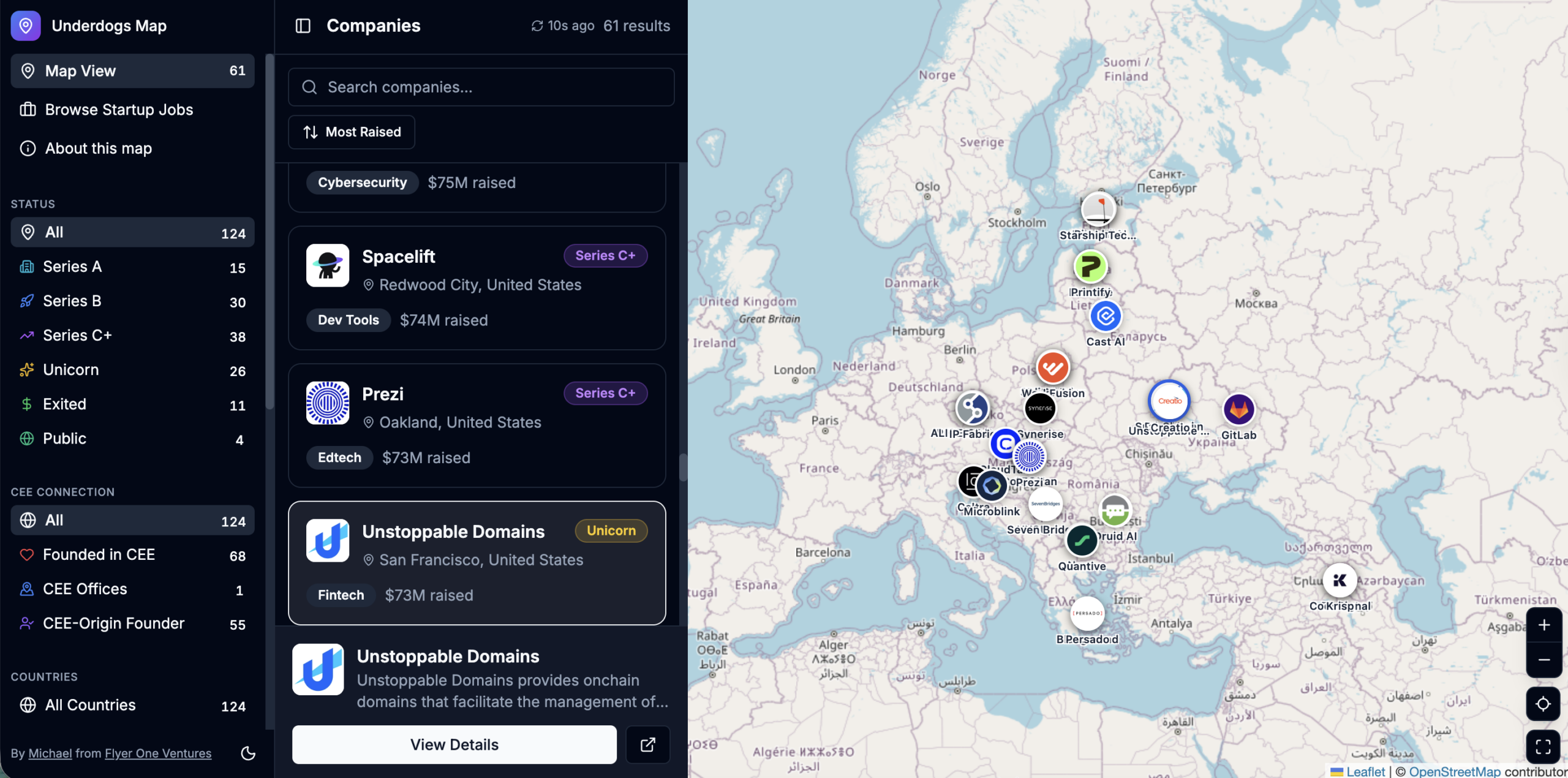 - Стартапи на мапі можна фільтрувати за стадією (від Series A до публічних компаній), країною, де базується головний офіс, та типом зв’язку із CEE (чи компанію засновано в регіоні, чи має тут офіси, чи серед фаундерів є вихідці з CEE).