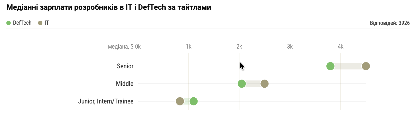 • Senior-розробники в DefTech заробляють у середньому $3800 — це на $700 менше, ніж в ІТ. Зарплати мідлів у середньому на $450 менші.