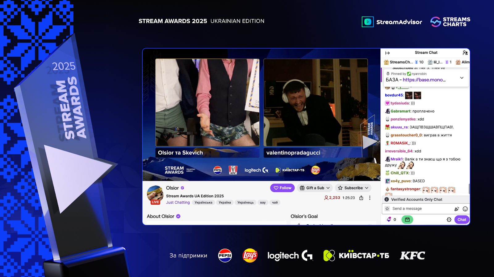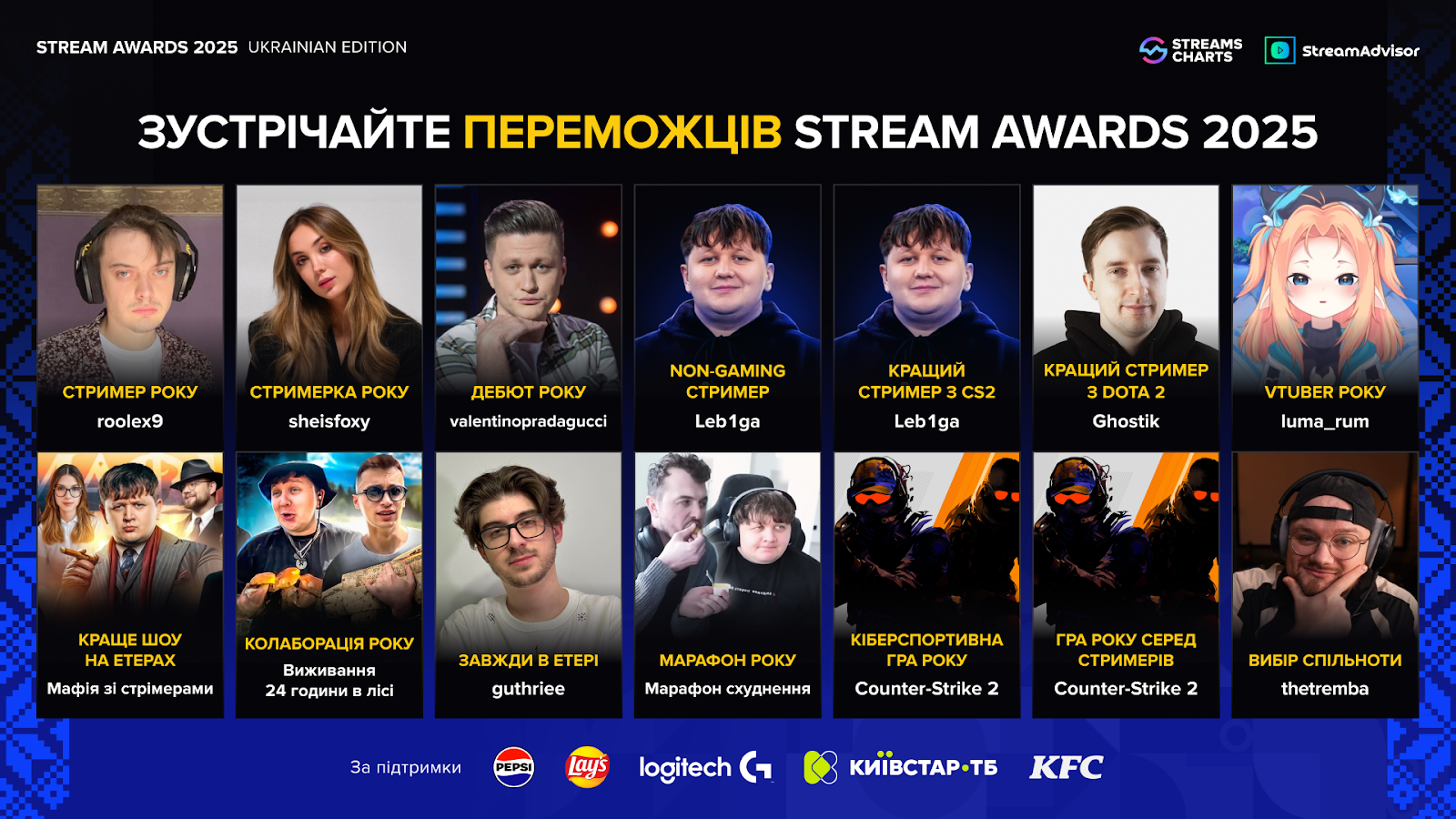 На Stream Awards 2025 оголосили найпопулярніших стримерів, ігор і лайв-шоу на українському Twitch і YouTube Live. Їх визначили на основі понад 82 000 голосів від понад 10 000 людей, голосування тривало два місяці. Про це Scroll.media повідомили організатори нагороди — компанія Streams Charts.