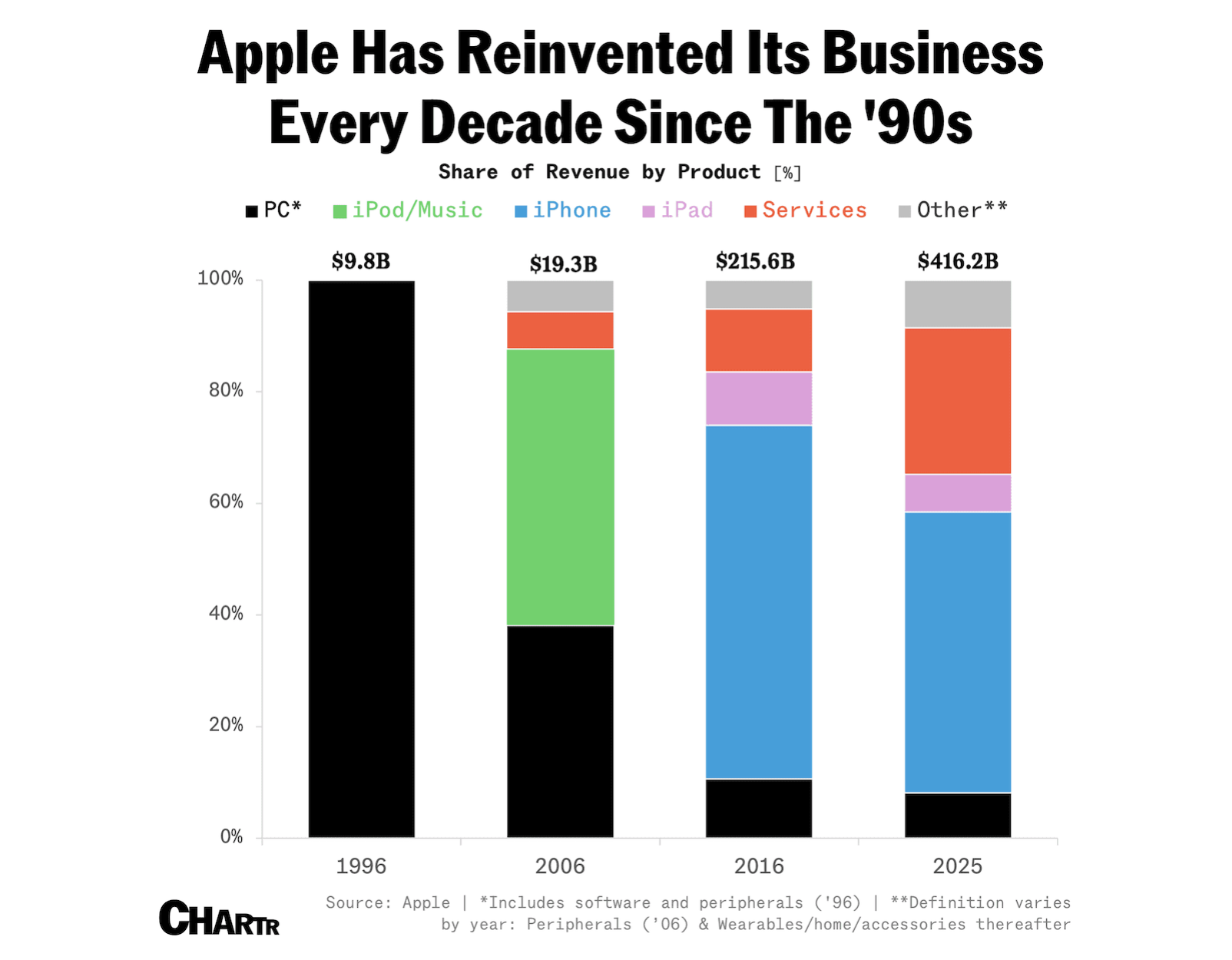 Практично перші два десятиліття Apple — компанія одного продукту, вона створювала компʼютери. Та згодом це перетворилось у бізнес, що винаходив себе кожні 10 років і робив зсув у цілих індустріях.