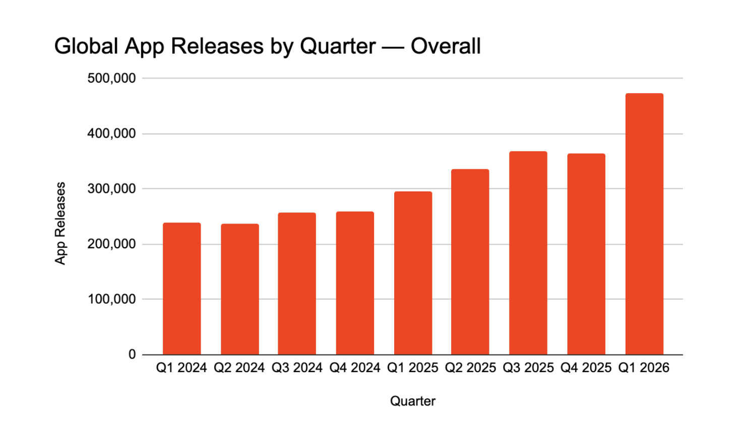 • У першому кварталі 2026 року кількість випущених застосунків у всьому світі зросла загалом на 60% у річному вимірі. Для App Store окремо цей показник ще вищий — 80%.