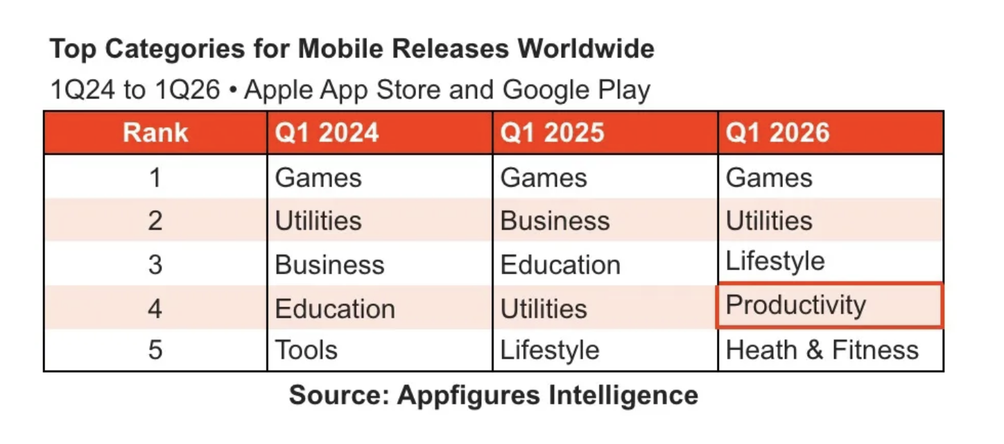 Мобільні ігри, як і в попередні роки, досі становлять більшість нових релізів у світі станом на перший квартал 2026 року. Але цього року до п’ятірки увійшли «продуктивність»-застосунки. Категорія «утиліти» піднялася на друге місце, «стиль життя» — з п’ятого на третє. П’ятірку замикають застосунки у сфері здоров’я та фітнесу.
