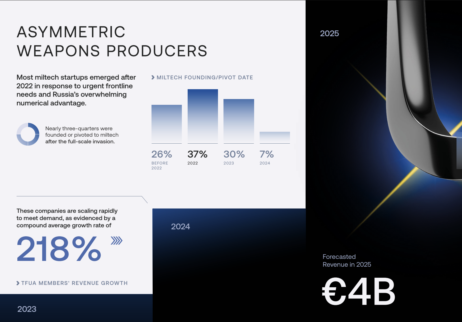 Revenue from Tech Force in UA participants, an association of more than 80 Ukrainian arms manufacturers, is projected to hit €4 billion in 2025, representing growth of more than 218% year-over-year. The forecast comes from a new analytical report by the Technological Forces of Ukraine and the Office of Effective Regulation (BRDO).