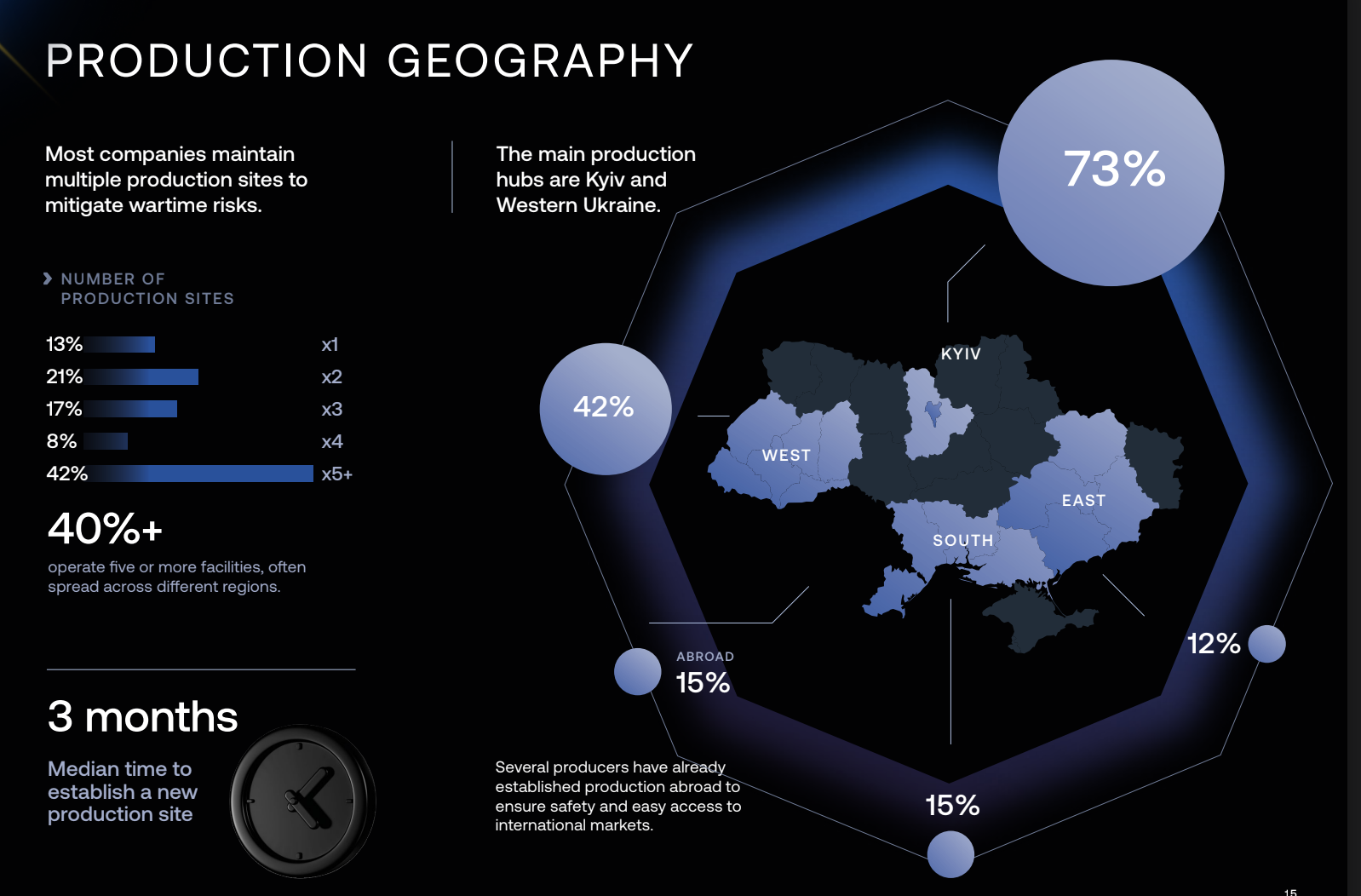 - Geography: Production hubs are concentrated in Kyiv and Western Ukraine, with most firms operating multiple sites. The median time to launch a new facility is just three months.