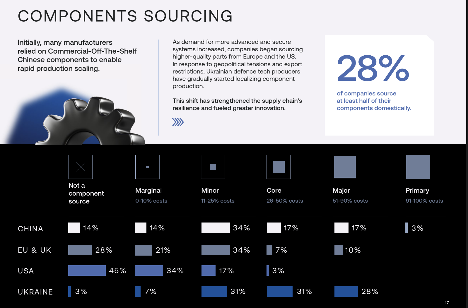 - Components shift: Reliance on commercially available Chinese parts is shrinking, replaced by European, American, and Ukrainian-made components. Already, 28% of surveyed firms source at least half of their parts domestically.