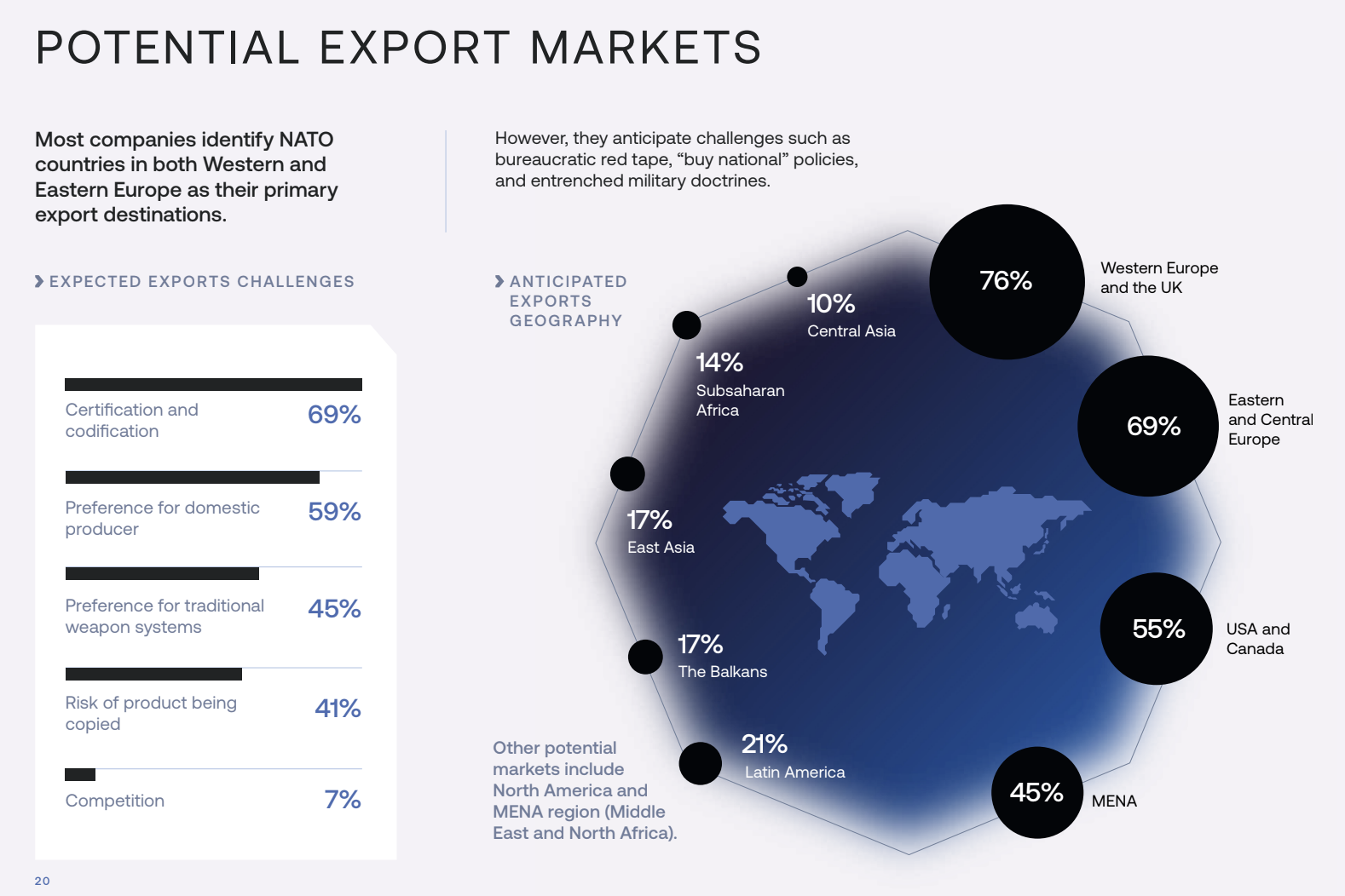 - Exports on the horizon: 97% of private defense manufacturers expect to open arms exports.