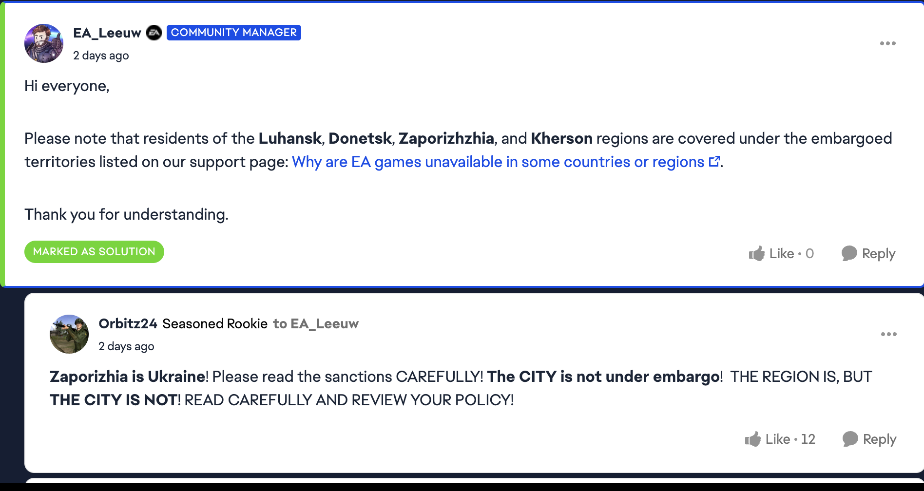 On the EA forum, users emphasize that Zaporizhzhia and Kherson are Ukrainian cities not occupied by Russia and, therefore, should not be subject to sanctions. So far, EA has not responded to these complaints.